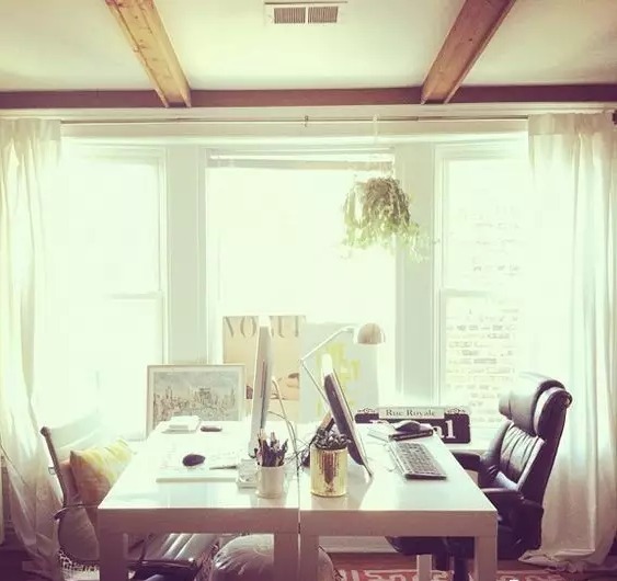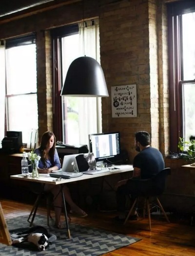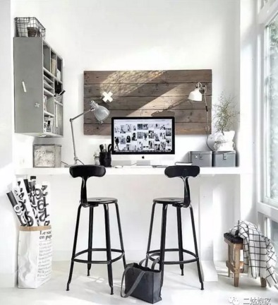 夫妻俩都是工作狂?不妨把客厅腾出几平米的空间,布置成工作台。放两张紧挨着的独立工作台,两把舒服的座椅,相对而坐,就能各自安静工作。
